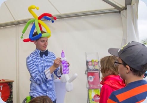 Ballonmodellage Der Knalleffekt im Anschluss an die Zaubershow! In den Händen von Felix entstehen direkt vor den Augen der Kinder wahre Kunstwerke aus Ballons.